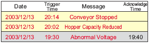 按照触发顺序,显示报警消息、数据、触发日期和触发时间。将在同一行中增加确认或恢复报警的时间。这样即可在一行中看到每个报警的状态变化。