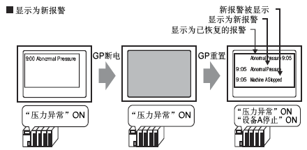 保留人机界面关闭前主机(PLC)的信息。GP关闭前显示的报警消息在电源再次打开后会连续显示。如果再次打开GP后报警的触发/恢复状态发生了更改,会将更改显示出来。
