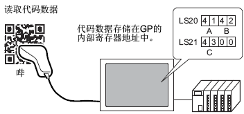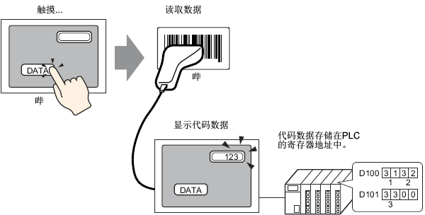 可以使用数据显示器部件将从条形码/2维码阅读器读取的代码数据保存在控制器/PLC的寄存器地址中,或者保存在人机界面的内部寄存器地址中。