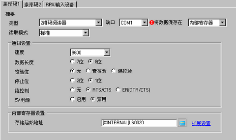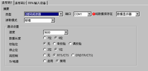 对于2维码阅读器,可设置的端口为COM1、USB和USB/串口。如果在机型中选择了IPC系列,则只能将端口设置为COM1。