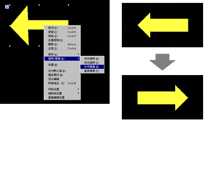 以对象的中心为基准,可以垂直(X轴)或水平(Y轴)翻转对象。选择要翻转的对象,并从右击菜单中指向[旋转/翻转(R)],点击[水平翻转(H)]或[垂直翻转(V)]。下面的例子显示一个水平翻转的多边形。请注意,当您翻转已经调用到画面中的画面、标记、部件和文本时,只反映显示位置。