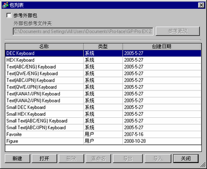 显示已在GP-Pro EX中注册的包列表。您可以注册自定义的部件、图形、键盘等。总共可以在一个[包列表]内注册200个图形、部件和键盘。如果绘图或部件在多个组中注册,它在包中只按一个进行计算。