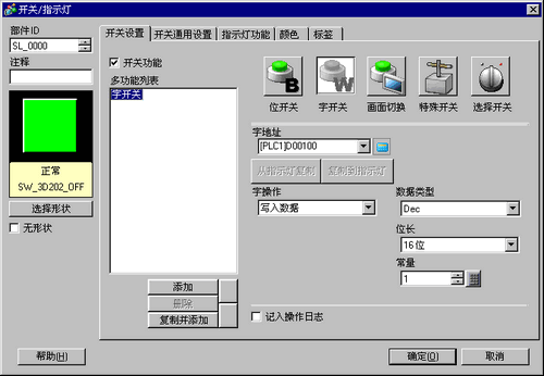 设置用于滚动消息的开关。从[部件(P)]菜单中选择[开关指示灯(C)],然后选择[字开关(W)]或点击
