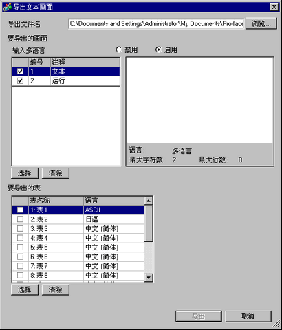 当输入多语言启用时显示。使用要导出的文本画面里设置的语言切换功能选择表。