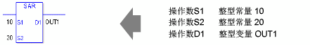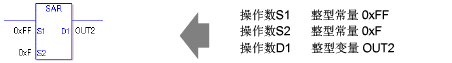 当执行SAR或SARP指令时,会将S1的各个位右移S2个位。每次移位时,最低位将丢失,最高位则被保存在最左边的空位中。最后将结果保存到D1中。SAR和SARP指令总是处于接通状态。使用SAR和SARP指令时,如果为操作数S1和D1指定的变量类型不同,就会发生错误。 请为操作数S1和D1指定相同的变量类型。