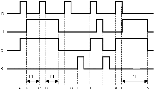 当R(复位)置ON时,Q(输出)和TI(定时器)复位。定时器当前值ET也被复位并清0。