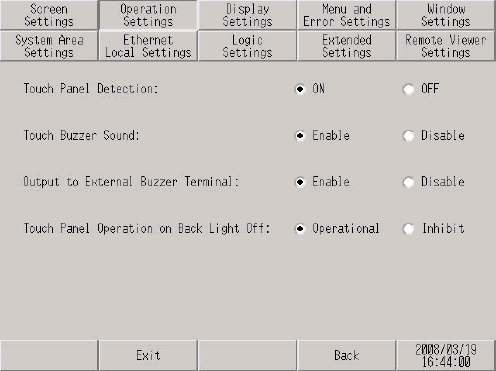 [Operation Settings]窗口打开时,在[Touch Panel Detection]字段中,选择 [ON]或[OFF]。