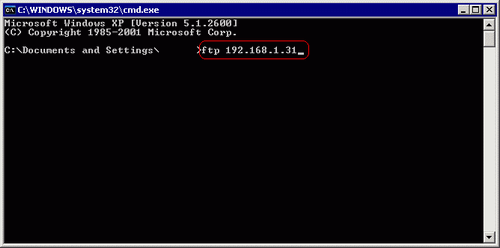 在命令提示符中输入“ftp”、空格和FTP服务器的IP地址(在本例中是“192.168.1.31”) ,然后按回车键。