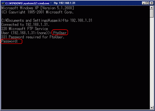 输入FTP登录用户的用户名(在本例中是“FtpUser”)和密码。输入密码时,光标不移动。