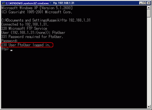 如果出现[230 User FtpUser logged in]消息,操作成功。