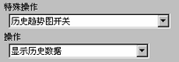 选择历史趋势图的显示历史数据开关操作:[显示历史数据开关]、[历史数据滚动]、[新数据滚动]、[缩小显示]和[放大显示]。