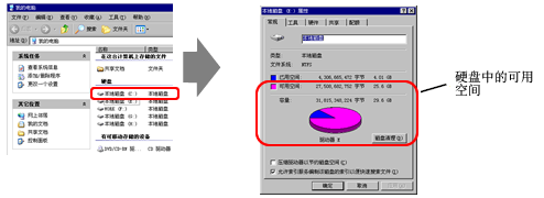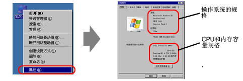 右击桌面上的[我的电脑]图标并从所显示的菜单中选择[属性]。在弹出[系统属性]后,检查您电脑的信息是否符合推荐运行环境的要求。如需检查硬盘容量,打开[我的电脑],右击安装了GP-Pro EX的驱动器,然后从所显示的菜单中选择[属性]。
