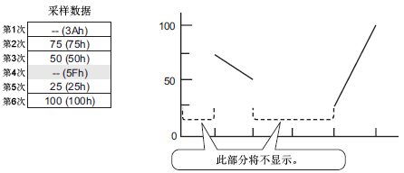 如果将[数据类型]设置为[BCD],且在包含A~F(h)的采样数据之前发生了数据读取错误,则从发生读取错误之前的数据到下一个有效数据之间,图表显示会停止。因此,包含A~F(h)的数据将和读取错误发生前的最后一个有效值一起显示在图表中。如果在读取错误发生前不存在有效值,该段时间的图表不显示。