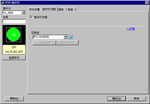 双击画面上放置的指示灯。画面上将显示[开关/指示灯]对话框。点击[扩展]。
