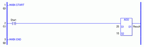当上升沿指令置ON时,将执行AND指令。当执行 ADD 指令时,在 D1 中保存结果值 40( 从 25 +15 = 40 计算中得来 )。