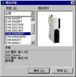 点击[添加模块],显示[模块详情]对话框。指定EX模块类型,然后点击[确定]。