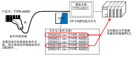 在下图中,与从条形码阅读器中读取的产品编号(条件名称)相匹配的CSV数据被传输到控制器/PLC。
