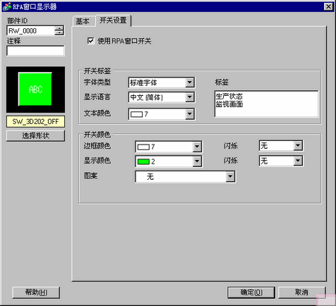选择[使用RPA窗口开关]复选框。必要的话设置[开关标签]和[开关颜色]中的各个项目。例如,生产状态观察画面