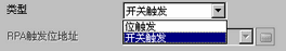 只有在[类型]选择为[开关触发]时,才会显示[开关设置]选项卡。如果选择“位触发”,请通过[RPA触发位地址]、D脚本、逻辑程序等指定该位的ON开关。