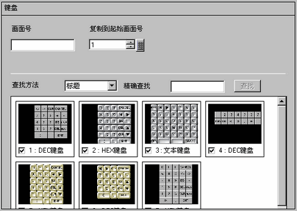 从[全部]、[基本画面]、[窗口画面]、[文本画面]、[键盘]、[视频模块窗口]、[全局功能]、[逻辑画面]、[I/O画面]、[报警设置]、[采样设置]、[全局D脚本]、[扩展功能脚本]和[用户定义功能]中选择画面列表。