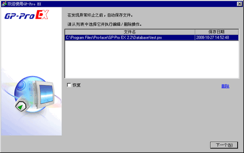 当程序在非正常状态关闭时,会在“backup”文件夹中创建备份文件。当您重新打开GP-Pro EX和恢复文件存在备份文件夹中时,将显示如下对话框。