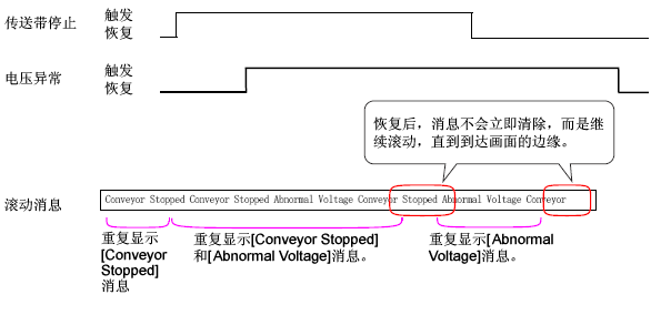 所有活动的报警消息将在画面上重复滚动。当[传送带停止]报警在消息滚动期间恢复时,最后一条[传送带停止]消息继续滚动,直到结束。之后,会反复显示[电压异常]消息。当[电压异常]报警恢复时,该消息的最后一条将继续滚动,直到结束。