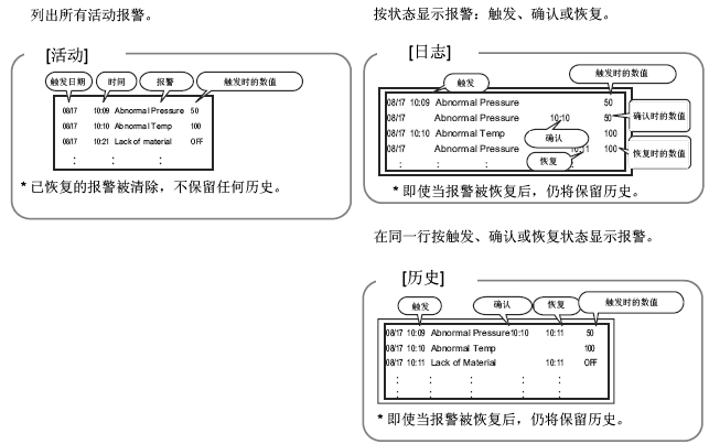 如果因通讯故障导致无法获取报警的触发、确认和恢复数据,则会显示“***”。打印或输出到CSV文件时将显示为“***”。