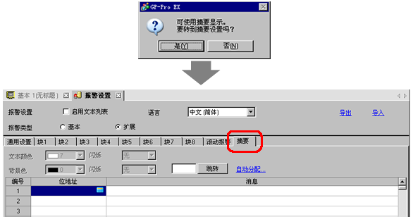 双击所放置的报警。然后将显示“报警”对话框。选择[摘要]。