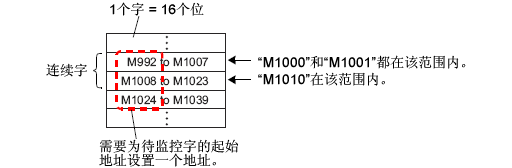 在[需监控的字的起始地址]处,使用一个被转换为16位字的值,来设置起始地址,该地址是[报警]中注册的位地址的起始地址。 例如,如需在摘要中显示已注册监控位“M1000”的消息,请在[需监控的字的起始地址]中指定“M992”,因为从M992到M1008的地址都包含在一个字中。