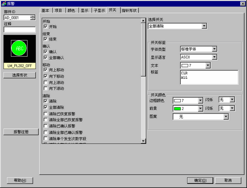 无论选择何种开关类型,开关颜色和形状的设置对所有报警部件都是相同的。如需更改各开关的形状和颜色,请使用开关指示灯部件[特殊开关(报警历史开关)]。