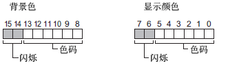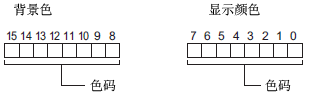 您可以设置显示颜色、背景色和闪烁属性。如下所示,在位0至7中保存显示色数据,在位8至15中保存背景色数据。