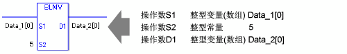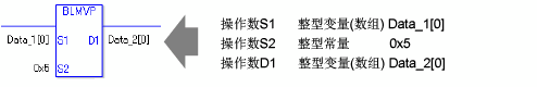 BLMV和BLMVP指令是块传送指令。当执行BLMV指令时,将S2中所示数量的数据元素从S1复制到D1。BLMV和BLMVP指令总是处于接通状态。使用BLMV和BLMVP指令时,如果为操作数S1和D1指定的变量类型不同,就会发生错误。 请为操作数S1和D1指定相同的变量类型。