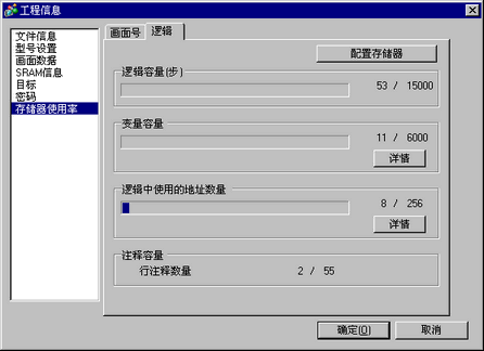点击[存储器使用率],然后点击[逻辑]标签来检查[逻辑容量(步)]、[变量容量]、[逻辑中使用的地址数量]和[注释容量]。