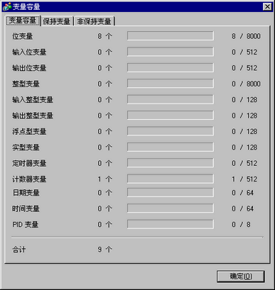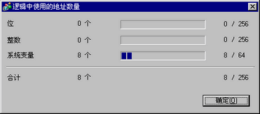点击[逻辑中使用的地址数量]的“详情”,查看当前数量、[位]、[整数]和[系统变量]的可分配数量以及总数。