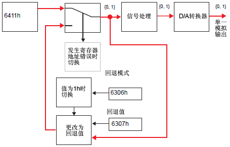 模拟输出由16位字写入。输出位保存在对象6411h的子索引里。发生错误时,它切换至后退模式。