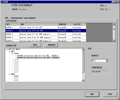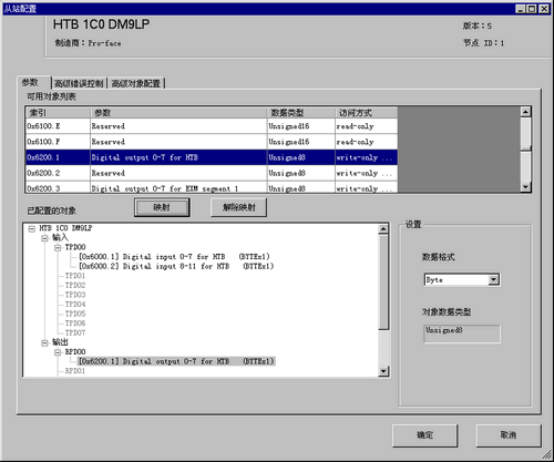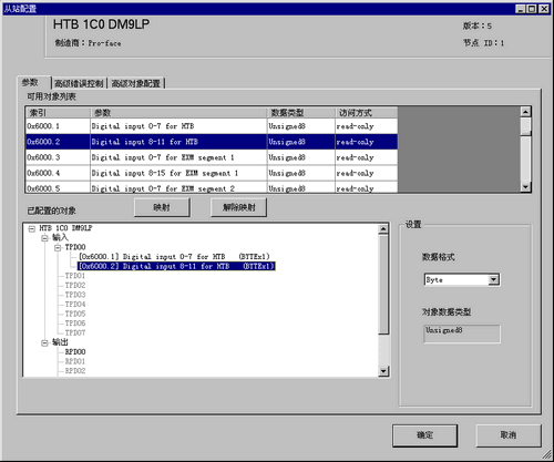 将来自HTB(CANopen从站)的输入数据映射到PDO的人机界面(CANopen主站)上 ,将与人机界面的输出数据相关的对象映射到RPDO的HTB上。