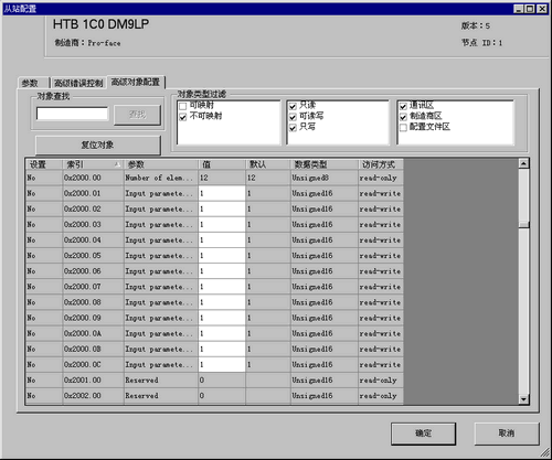 打开[高级对象配置]选项卡来配置对象值。根据要求设置输入过滤器(0x2000.1至0x2000.C)、后退模式(0x6306.1)和后退值(0x6307.1) ,点击[确定]关闭对话框。
