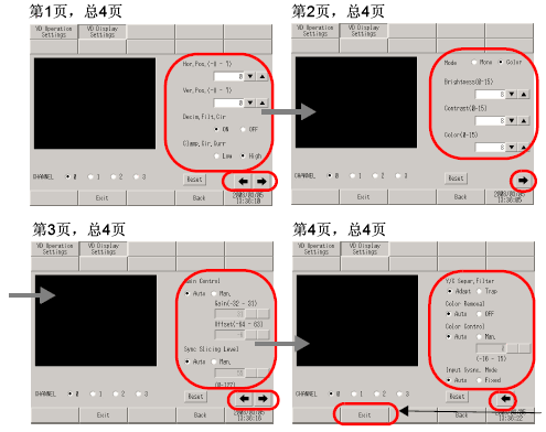 [Video Display Adjustment]画面打开。检查设置或触摸需要修改的项目。如需转到下一页,请触摸屏幕右下角的向右箭头。