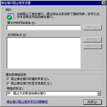 在Internet Explorer的[工具]菜单,指向[弹出窗口阻止程序]并选择[弹出窗口阻止程序设置]。