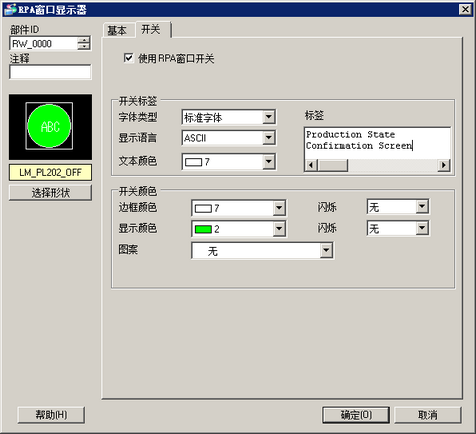 勾选[使用RPA窗口开关]复选框。必要的话设置[开关标签]和[开关颜色]中的各个项目。例如,生产状态观察画面