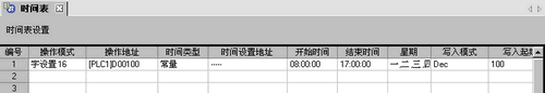 从星期一至五,在开始时间 (8:00) 将运行模式温度100写入字地址D100,在结束时间 (17:00) 将待机模式温度40写入此地址。