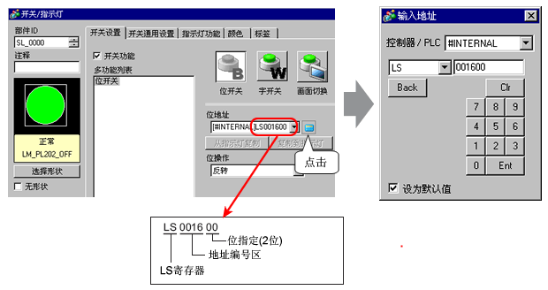 设置[位地址]。从[控制器/PLC]中选择[#INTERNAL] 并指定LS0016位0。