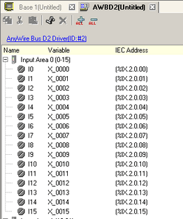 The input area or output area set up in the [I/O Driver Settings] are shown on the I/O Screen as I/O terminals for each AnyWire slave unit. You can control the I/O by mapping variables to the I/O terminals.