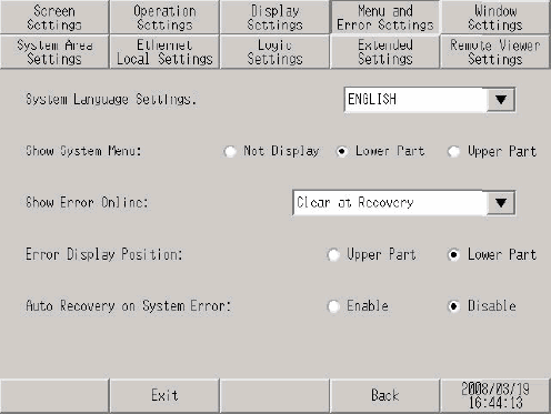 [Menu and Error Settings] screen opens. In the [System Language Settings] touch