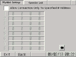 [Master]. After selecting this option, go to the next screen by touching the arrow button displayed at the bottom right of the screen. [Allow Connection Only to Specified IP Address]. Select this option and touch the address. In the keypad, enter the address of the allowed connection.