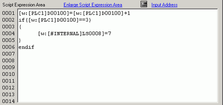 Create the script (Expression Area). For information about commands and functions, see 22.11 Built-In Function (Instruction) / Conditional Expressions.