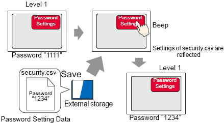 Prepare password setting data in CSV format and save it in external storage.Using a special switch for which [Password Settings (Screen Input)] is set, you can reflect the data by loading the password setting data on the display unit during operation.