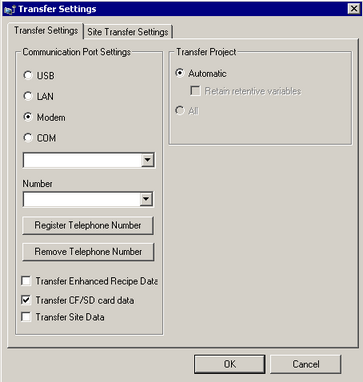 Click [Transfer Settings] and the following dialog box will appear. Select [Modem] in the [Communication Port Settings].