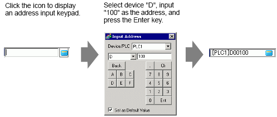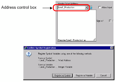 Without registering the symbol first, you can directly enter the symbol name in the address control box when designating the address. Once you enter the symbol, press the [Enter] key. When the following message appears, click [Register as Symbol]. Once registered, you can check the symbol in the Common Settings [Symbol Variable].