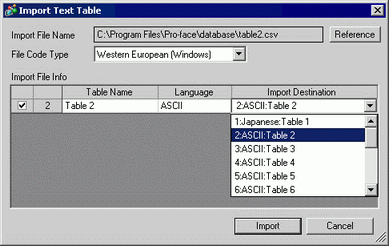 Select a destination table. The Text Table is imported to the designated table by overwriting it.